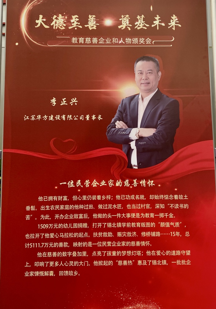 江蘇華方建設(shè)有限公司李正興董事長榮獲“無錫教育慈善人物”榮譽稱號,華方建設(shè)黨支部書記、副董事長李燕嵐女士作為代表接受表彰。