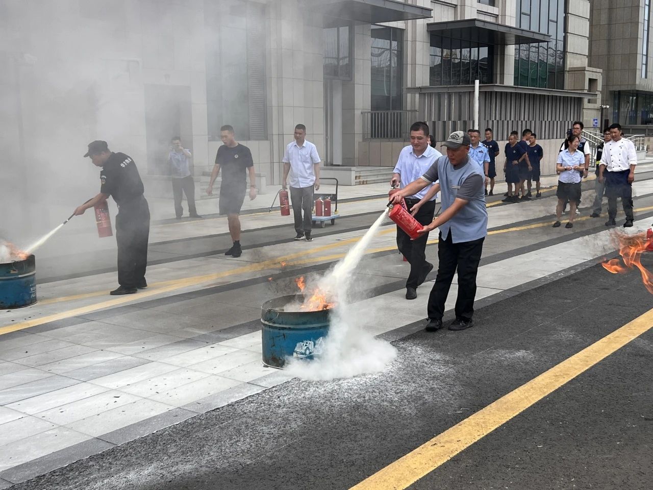 為強化培訓效果,現場空曠區域設置模擬火點(鐵桶燃燒木柴),組織全員分批實操。